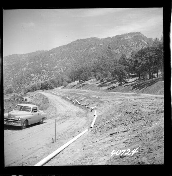 Big Creek Powerhouse #3 - Progress picture taken from house 13 looking toward site of houses 7 to 12 inclusive. [Sewer and water line tunnel excavated in road in front of these houses. Water and sewer pipe strung out along trench, ready for installation.]