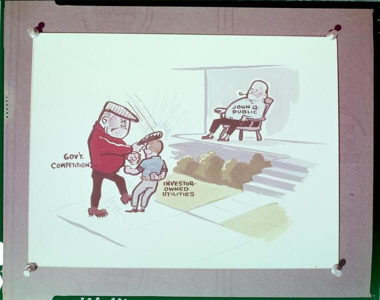 Political cartoon portraying government discrimination towards Investor-owned Utilities (color trans.)