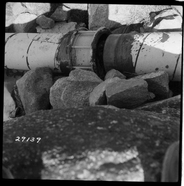 Big Creek, Florence Lake Dam - Tombstone Creek Diversion - Note bent pipe up in air. Other pipe bends sunk into ground & loose.