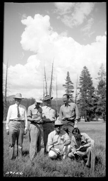 Big Creek, Vermilion Dam - Mr. Chadwick, Mr. Hendee, Mr. Adams, Mr. Quinton, & Mr. Davenport. [in front of Edison Lake Monument]
