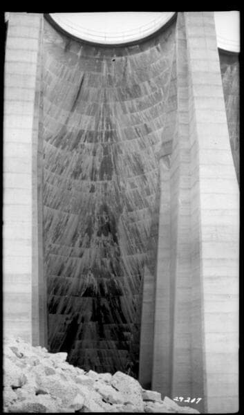 Big Creek, Florence Lake Dam - View of downstream side of Arch 53, lake elevation 7261.90. Note slight dampness along 7252 joint 5' left to 20' right of centerline, also trace of asbestile waterproofing applied on upstream face duing spring of 1941 showing through joint at elevation 7260 5' left of centerline.