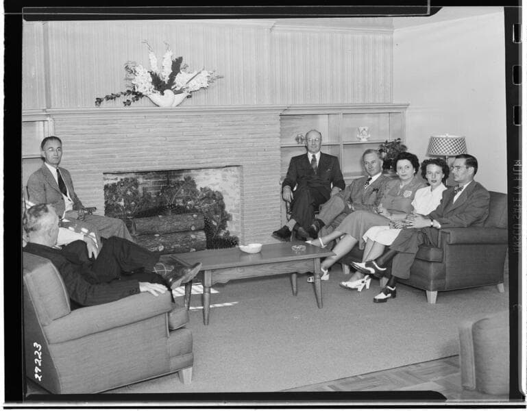 Big Creek General - New Guest House interior. Lounge Room - L-R Ray Stator, Kathleen Buel, Mrs. Stator, O. S. Hughes, Mrs. Hughes, Dr. Walter Buel, & Mrs. Buel.