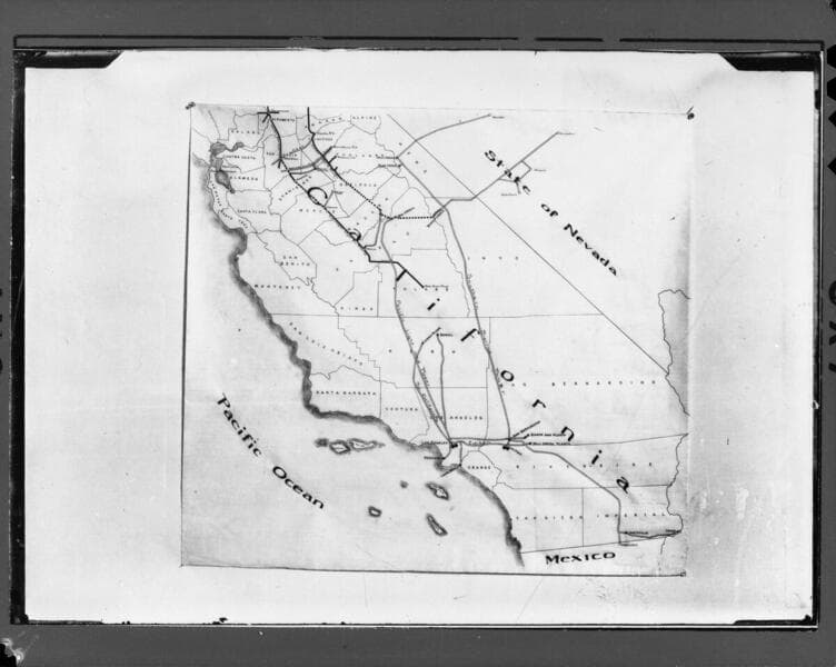 Partial map of California showing the early transmission line corridors belonging to Pacific Light and Power, Pacific Gas & Electric, Southern California Edison, Southern Sierras Power Co., San Joaquin Light & Power, Sierra & San Francisco Power and Western States Gas & Electric. No number originally assigned by Cal. Electric and - no documentation included.