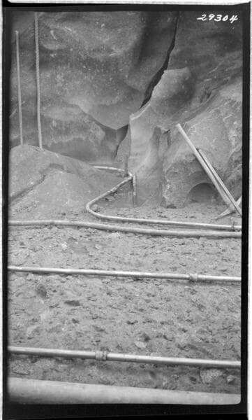 Big Creek Powerhouse #4 - Construction pictures taken by Dam & Tunnel office. [Preparing bedrock for first concrete footing pour - cooling pipes(?) laid out over riverbed. ]