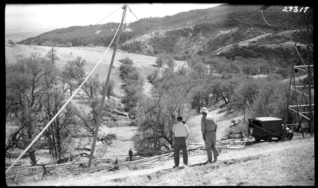 Magunden-Mesa Transmission Line - Erecting tower with corner gin pole.
