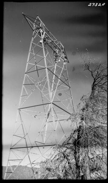 Magunden-Mesa Transmission Line - Erecting 2nd tower west of Tejon Summit. Note cleaving for Vincent line and New line. M34-T4.