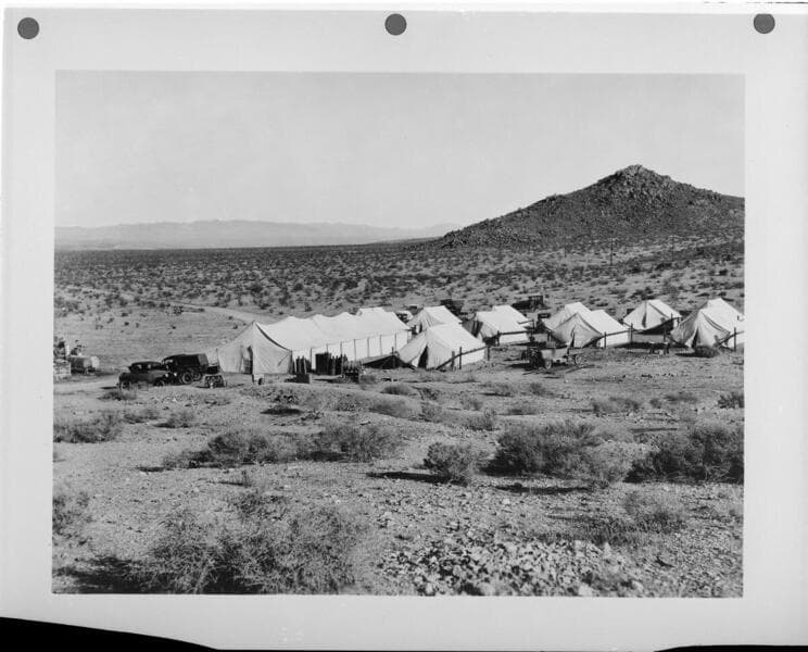 Unidentified snapshots depicting facilities and buildings in territory operated by Southern Sierras Power Company, including views of a pole yard, field crews constructing a wood pole transmission line in the desert, Southern Sierras Power Company portable office trailers being moved into construction camps. Photographer: Southern Sierras Power Company.
