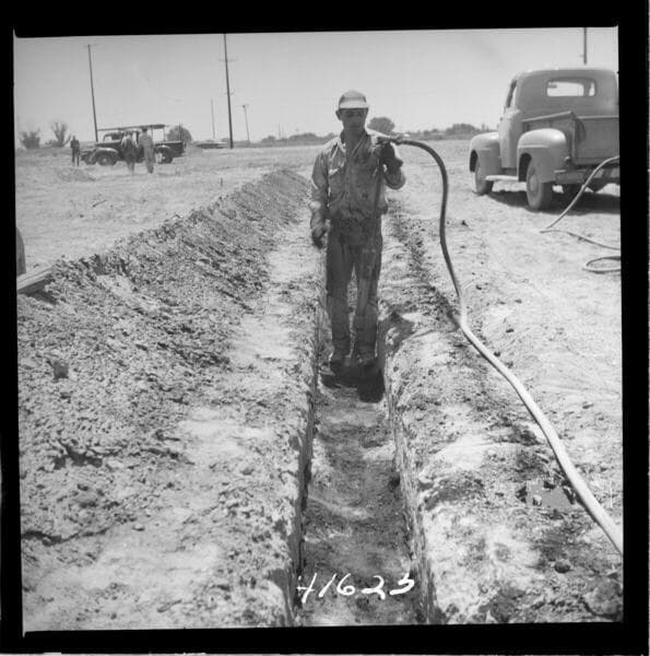 Miscellaneous Facilities - Hanford Pole Yard - Progress picture showing placement of conduit surrounded by oil-sand in trench under area to be paved.