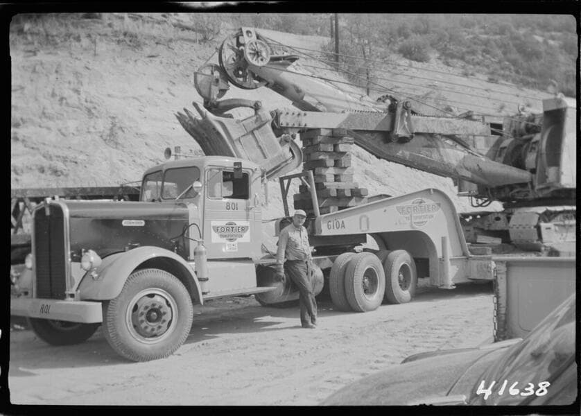 Big Creek Powerhouse #4 - New Fortier Truck #801 & Trailer moving power shovel to Damsite.