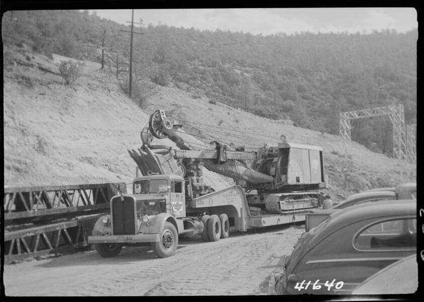 Big Creek Powerhouse #4 - New Fortier Truck #801 & Trailer moving power shovel to Damsite.
