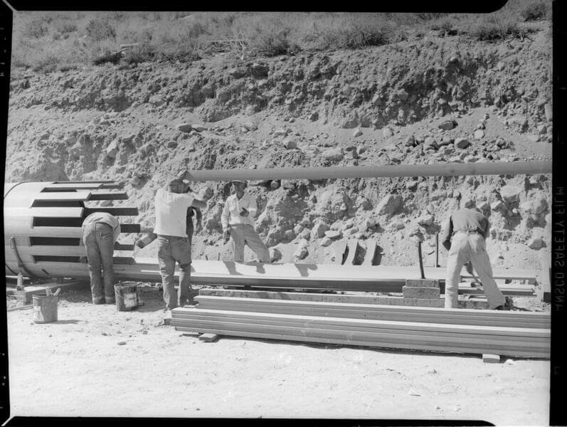Men constructing redwood-stave flowline from Bishop Creek plant 4 to plant 5 forebay.
