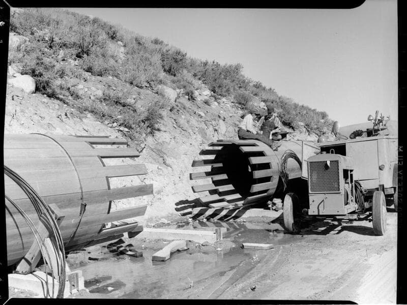 Men constructing redwood-stave flowline from Bishop Creek plant 4 to plant 5 forebay.