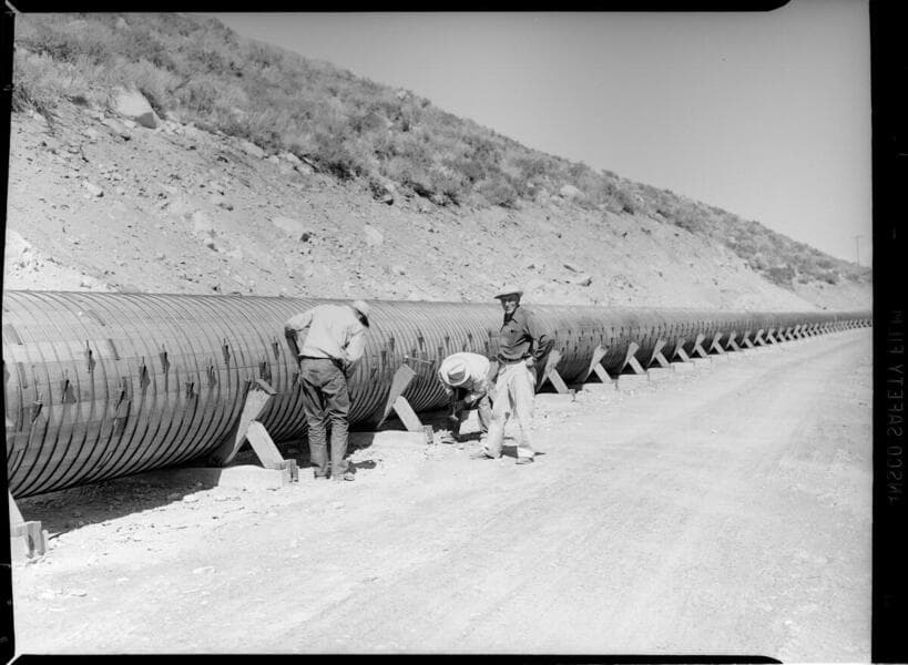 Men constructing redwood-stave flowline from Bishop Creek plant 4 to plant 5 forebay.
