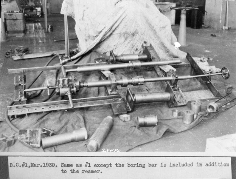 Big Creek Powerhouse #1 - Boring bar for machine bucket bolt holes, Unit #4. Line-up bar, split bushings & bearing.