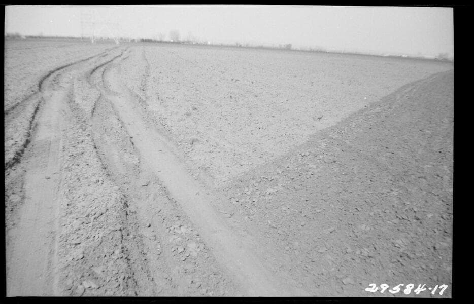 Magunden-Mesa Transmission Line - View north of M4-T3 shows the effect of tracks after cultivation, and reason hand work is necessary to get water through. Cagarette pack for comparicon of depths. R.P.K.
