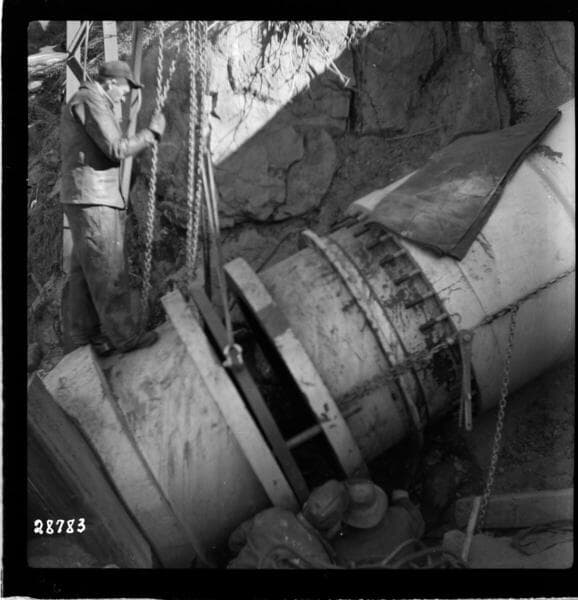 Big Creek Powerhouse 2A - Penstock "Y" near plant, showing installation of bulk-head which will shut off water to #1 generator.