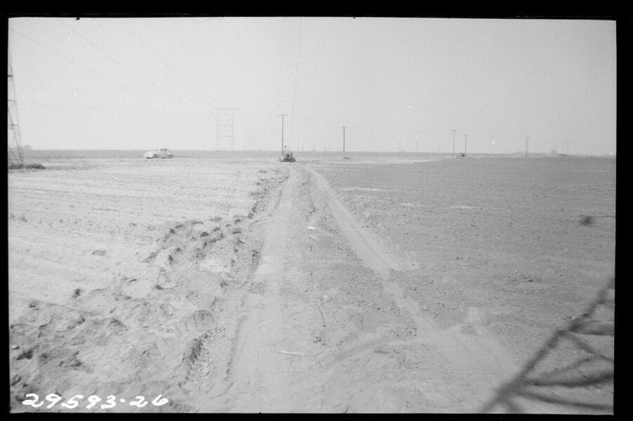 Magunden-Mesa Transmission Line - In vicinity of M7-T2 shows about the average of road operations and tracks through potato field. This picture in the Johnston-Hertz field which was entered under the favorable conditions of any field that we entered insofar as the moisture of the soil at the time of entry is concerned.