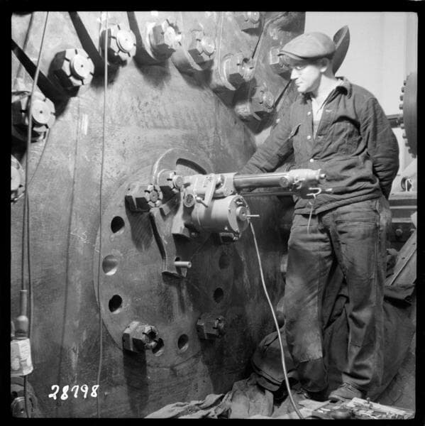 Big Creek Powerhouse #1 - Boring bar for machine bucket bolt holes, Unit #4. Lower positon, right hand side.