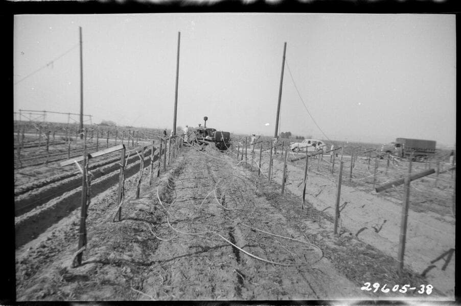 Magunden-Mesa Transmission Line - Conductor reel set in vinyard between M8-T3 & M8-T4. Note necessary break of wire supported grape row. R.P.K.