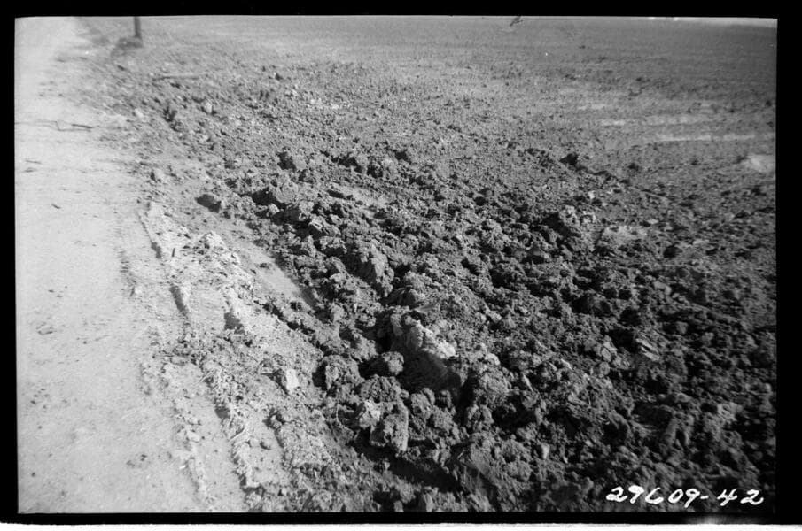 Magunden-Mesa Transmission Line - View north of M4-T3 shows the effect of tracks after cultivation, and reason hand work is necessary to get water through. Cagarette pack for comparicon of depths. R.P.K.