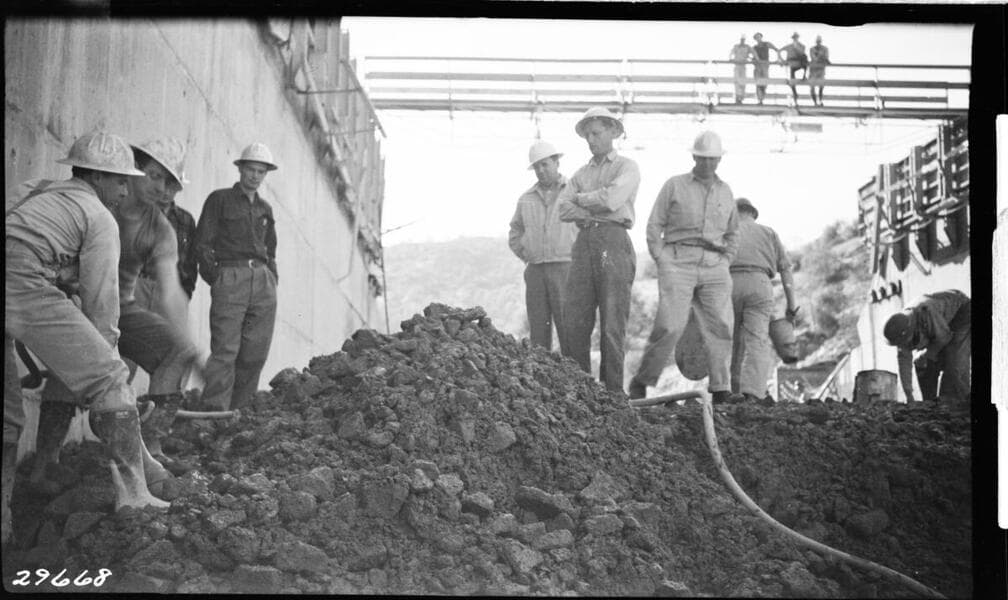 Big Creek Powerhouse #4 - Polioka Jr., Greenleaf, R. E. Davis Jr., Prof. Raymond E. Davis watching Pozzolan Concrete in Block 9.