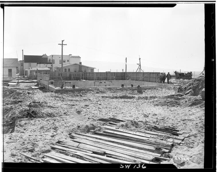 Redondo Beach Steam Station - Plant #1 - Looking southwest over pump house site, and showing offshore core boring operations for underwater tunnels. Temporary substation in foreground.