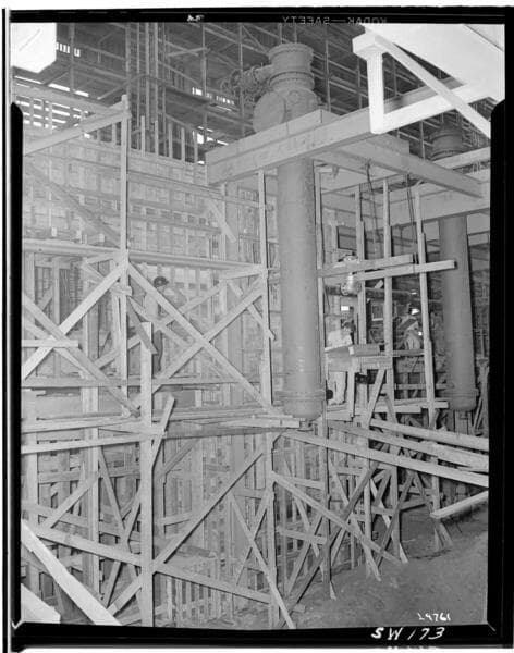 Redondo Beach Steam Station - Plant #1 - Looking west toward #1 turbine support. Concrete poured to air ejector floor. Final pour to Turbine Room floor scheduled for 7/22/1947.