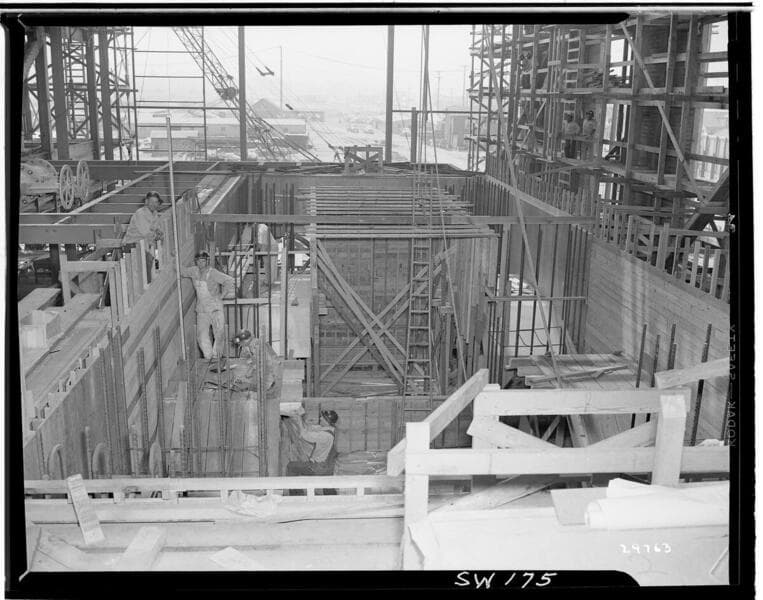 Redondo Beach Steam Station - Plant #1 - Looking west toward #1 turbine support. Concrete poured to air ejector floor. Final pour to Turbine Room floor scheduled for 7/22/1947.