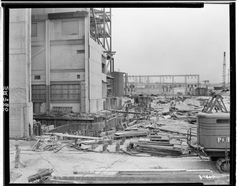 Redondo Beach Steam Station - Plant #1 - Looking northeast showing top of #2 house turbine support, east wall of Turbine Room and firing aisle in auxiliary bays.