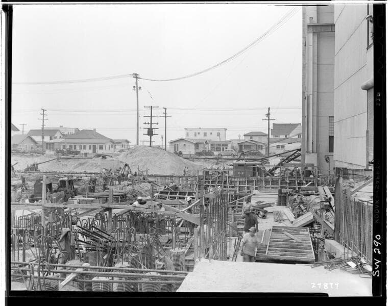 Redondo Beach Steam Station - Plant #1 - Looking west towards Auiliary Bay & Turbine Room excavation. Piles in left foreground for stack #3 foundation. #3 generator leads tunnel base in right foreground.