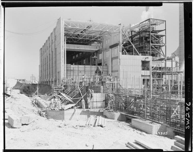 Redondo Beach Steam Station - Plant #1 - Looking southwest over south end of Hermosa Ave. detour west of turbine room wall. Detour required to install circulating water lines in street area.