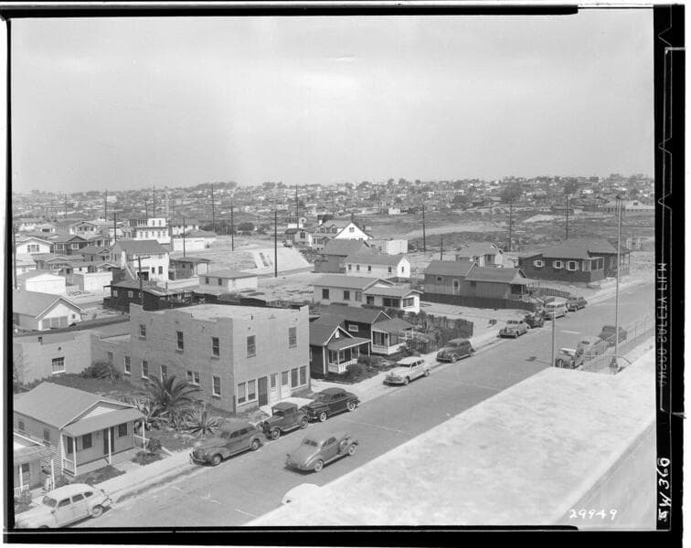 Redondo Beach Steam Station - Plant #1 - Looking northeast from circulating water pump house roof towards buildings north of Administration Building, to be razed for proposed car shelters.