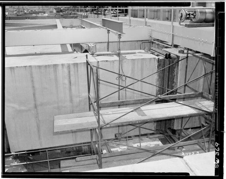 Redondo Beach Steam Station - Plant #1 - Looking southeast toward intermediate drum, downcomer and side wall tubes for #5 boiler.