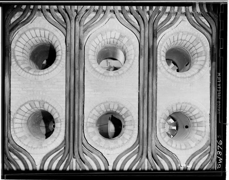 Redondo Beach Steam Station - Plant #1 - Looking west at burner wall of #6 boiler showing Spallac brand fire bricks in place.