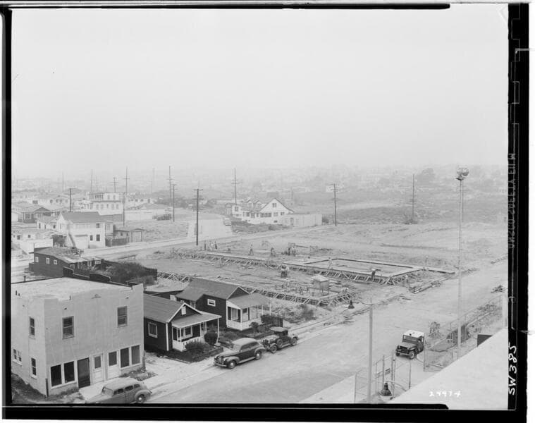 Redondo Beach Steam Station - Plant #1 - Looking northeast from Administration Building roof showing a portion of the between 11th and Hermosa Streets to be cleared for car shelters.