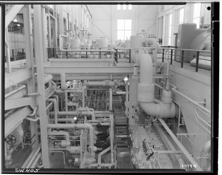 Redondo Beach Steam Station - Plant #1 - Looking northeast in Turbine Room showing Westinghouse Unit #3 in foreground and Units 1 & 2 in background.