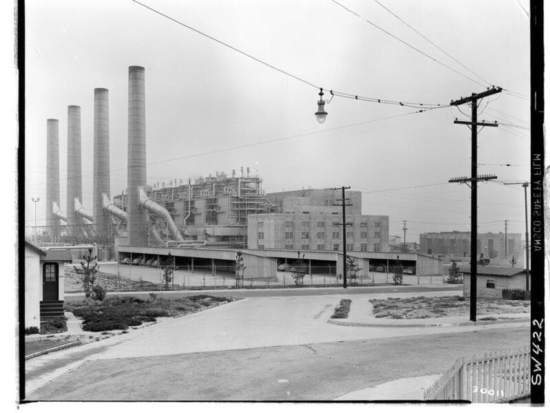 Redondo Beach Steam Station - Plant #1 - Looking southwest towards the administration building. Circulating water pump house in the background.