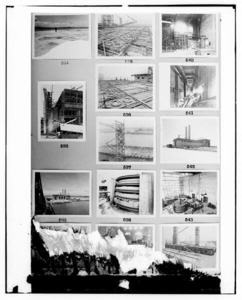 This is a multi-image negative that depicts construction of Long Beach Steam Plant. Undamaged images included on the plate are copies of original negatives: 02 - 00561; 02 - 00562; 02 - 00563; 02 - 00565; 02 - 00566; 02 - 00567; 02 - 00569; 02 - 00571; & 02 - 00572. Frames 02 - 00560; 02 - 00564; & 02 - 00568 have severe water damage and are unusable.