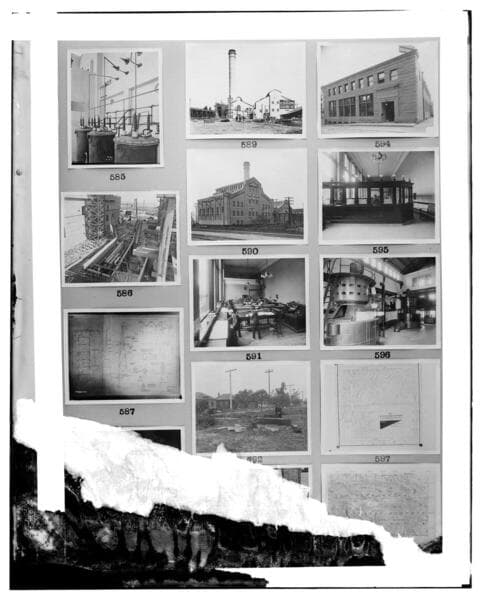 This is a multi-image negative that depicts steam plants, and local offices. Undamaged images included on the plate are copies of original negatives: 02 - 00615; 02 - 00616; 02 - 00617; 02 - 00618; 02 - 00620; 02 - 00621; 02 - 00622; 02 - 00623; 02 - 00625; 02 - 00626; & 02 - 00627. Frames 02 - 00614; 02 - 00619; & 02 - 00624 have severe water damage and are unusable.