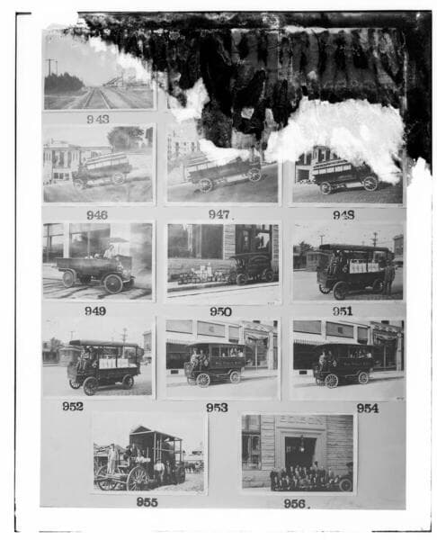 This is a multi-image negative that depicts group portraits, horse drawn vehicles, substations, and L.B.S.P. construction. Undamaged images included on the plate are copies of original negatives: 02 - 01854; 02 - 01855; 02 - 01856; 02 - 01857; 02 - 01858; 02 - 01859; 02 - 01860; 02 - 01861; 02 - 01862; & 02 - 01863. Frames: 02 - 01849; 02 - 01850; 02 - 01851; 02 - 01852; & 02 - 01853 have severe water damage and are unusable.