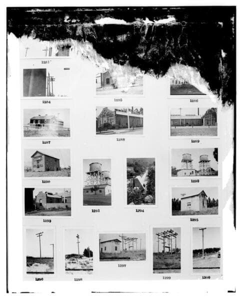 This is a multi-image negative that depicts tower tests, night cityscapes, insulator company, Kern River 1 buildings and group shots. Undamaged images included on the plate are copies of original negatives: 02 - 01034; 02 - 01035; 02 - 01037; 02 - 01038; 02 - 01039; 02 - 01040; 02 - 01041; 02 - 01042; & 02 - 01043. Frames: 02 - 01031; 02 - 01032; 02 - 01033; & 02 - 01036 have severe water damage and are unusable.