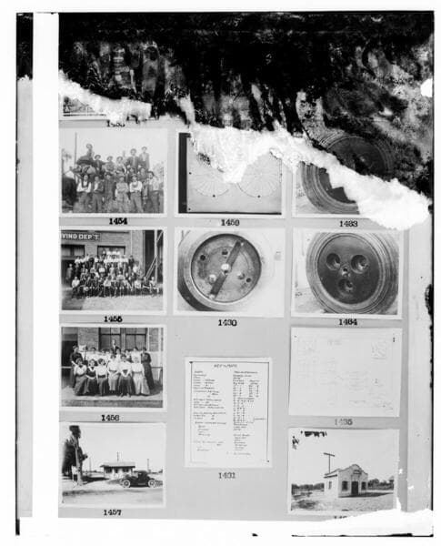 This is a multi-image negative that depicts offices, group shots, trucks, garage, and a map. Undamaged images included on the plate are copies of original negatives: 02 - 01923; 02 - 01924; 02 - 01926; 02 - 01927; 02 - 01928; 02 - 01929; 02 - 01930; & 02 - 01932. Frames: 02 - 01925; 02 - 01931; 02 - 01933; 02 - 01934; 02 - 01935; & 02 - 01936 have severe water damage and are unusable.