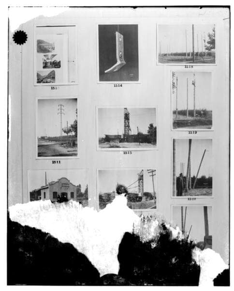 This is a multi-image negative that depicts substations, concrete pole tests, wood pole tests, and streetlighting. Undamaged images included on the plate are copies of original negatives: 02 - 01522; 02 - 01523; 02 - 01524; 02 - 01525; 02 - 01526; 02 - 01527; 02 - 01528; 02 - 01530; 02 - 01531; & 02 - 01532. Frames: 02 - 01529; 02 - 01533; 02 - 01534; & 02 - 01535 have severe water damage and are unusable.