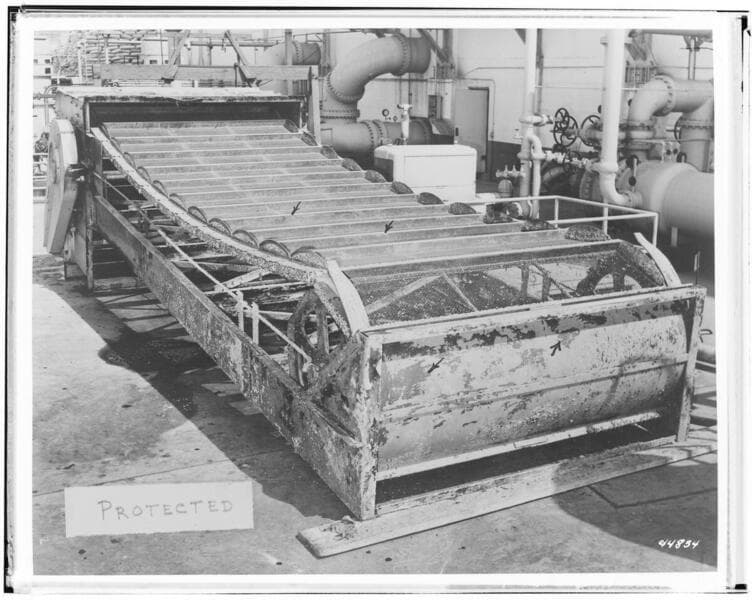 Power Producers - Not SCE - San Diego Gas & Electric Co. - Close-up of protected circulating water screen [from the cooling water intake system at steam plant]