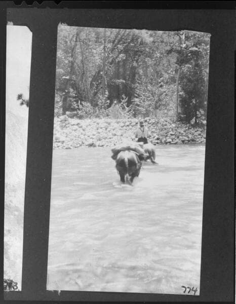 Kings River Project - Rock house in the Tehipiti Basin. [A man on horseback standing outside.]