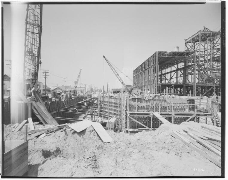 Redondo Beach Steam Station - Plants 2-5 - Screenwell, water intake & discharge tunnel construction - looking north.