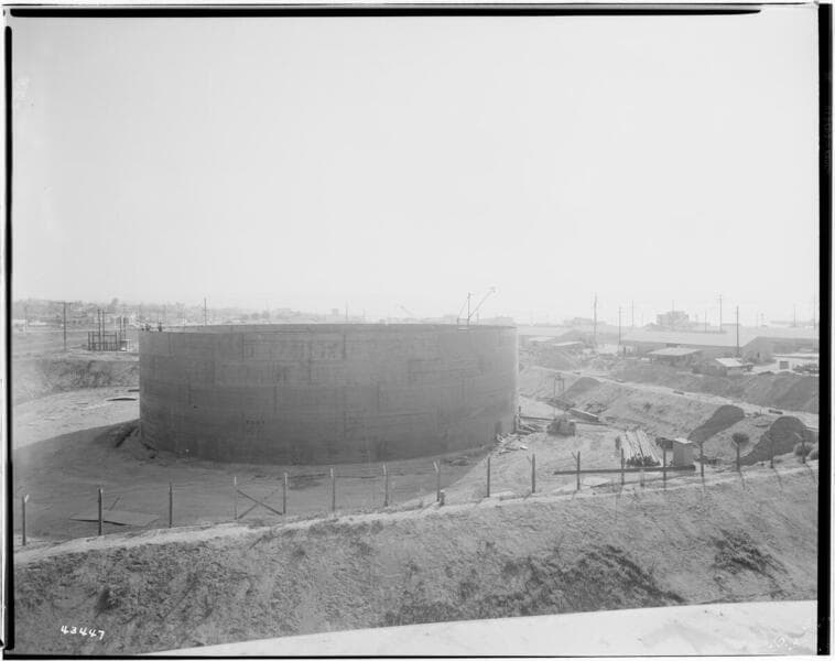 Redondo Beach Steam Station - Plants 2-5 - Fuel Oil Tank enclosure, from top of dike at northwest corner.