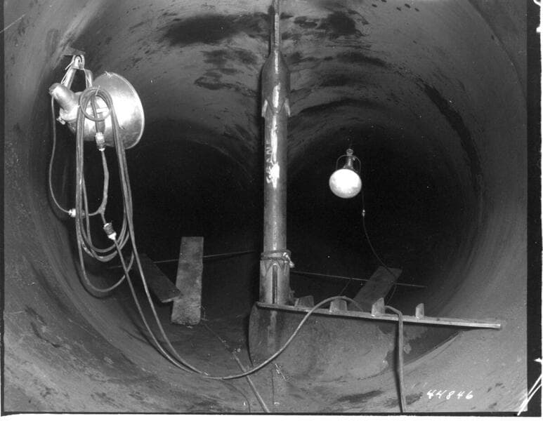 Portal Powerhouse - 2nd of 3 flash pictures of completed wye-branch reinforcement; close-up of welding details at bottom of pipe columns.