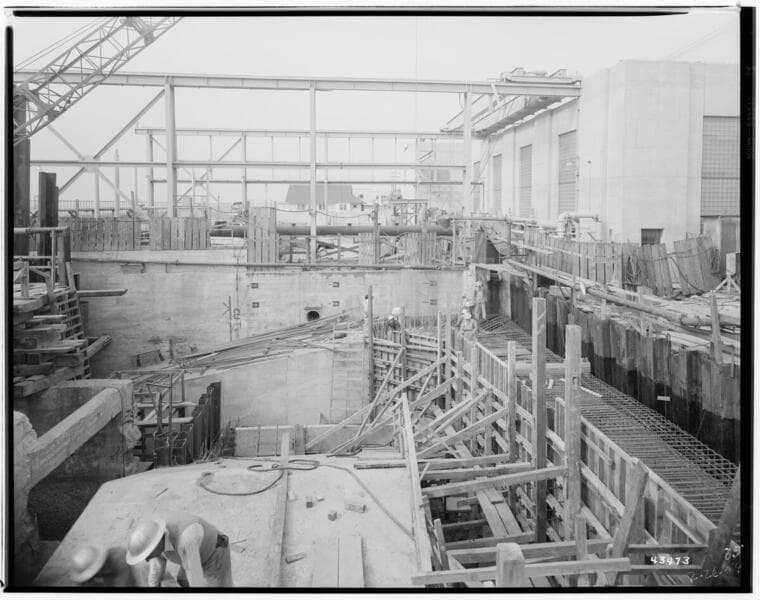 Redondo Beach Steam Station - Plants 2-5 - Screenwell & circulating water intake & discharge tunnel construction - looking north.