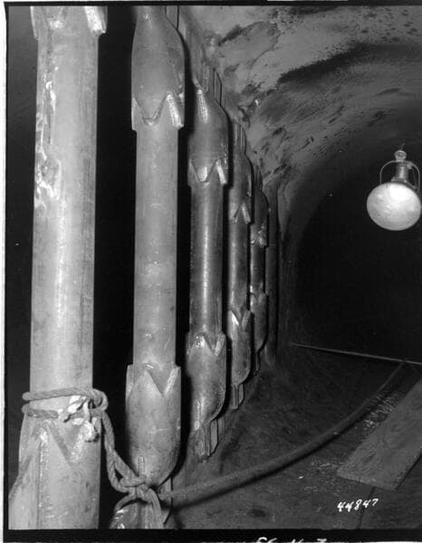 Portal Powerhouse - 1st of 3 flashlight close-ups of completed wye-branch reinforcement looking downstream into branch pipes showing upstream pipe columns and rock deflector.